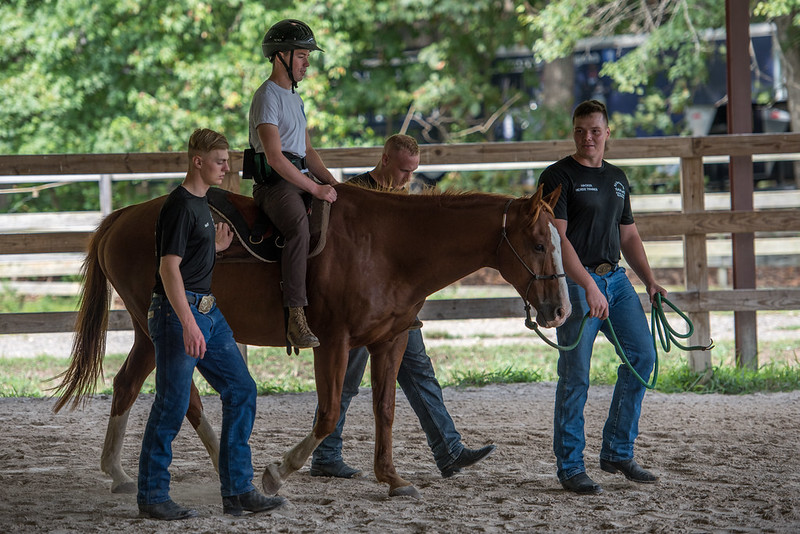 Soldiers assigned to the U.S. Army Caisson Platoon, 1st Battalion, 3d U.S. Infantry Regiment (The Old Guard) partner with physical therapist, with Fort Belvoir Community Hospital, to conduct Equine Movement Therapy, at Fort Belvoir Stable, Virginia, on September 5, 2019. The partnership work together to rehabilitate veterans, both active duty and retired. (U.S. Army photos by Sgt. Nicholas T. Holmes)