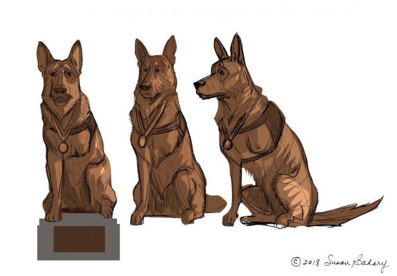 The conceptual sculpture of Kurt is shown in action and represents ALL of the war dogs and their handlers during WWII.